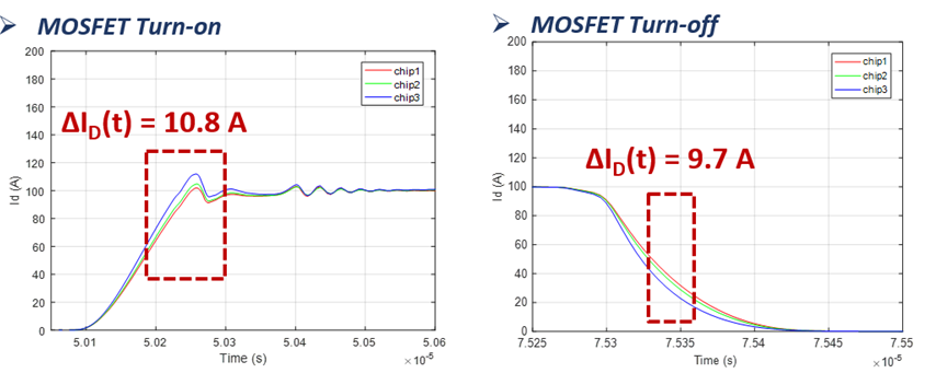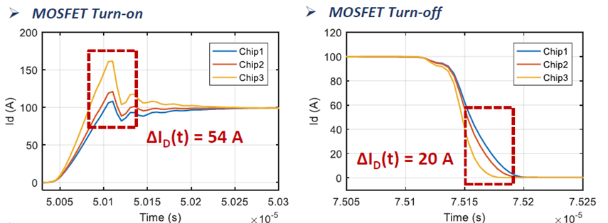 碳化硅SiC電控系統(tǒng)的開發(fā)難點(diǎn)主要在于SiC模塊的本體設(shè)計及高速開關(guān)帶來的系統(tǒng)EMC問題應(yīng)對。臻驅(qū)科技開發(fā)的這臺電機(jī)控制器采用了日本羅姆ROHM最新發(fā)布的第四代碳化硅SiC芯片。相較于傳統(tǒng)的IGBT器件,SiC器件在實際多芯片并聯(lián)應(yīng)用時會出現(xiàn)許多本體設(shè)計挑戰(zhàn),如多芯片間的電流不均衡會導(dǎo)致進(jìn)一步的熱不均限制芯片的滿額使用(如圖1改善前與改善后的對比),芯片結(jié)電容與回路漏感構(gòu)成的LC諧振,同時高的di/dt在回路漏感上產(chǎn)生較大的電壓過沖限制了模塊的輸出能力等,綜合來看重點(diǎn)在于多維度設(shè)計考慮,避免單一因素的短板效應(yīng)制約SiC在輸出能力、效率等方面的優(yōu)勢。同時還需考慮工藝及成本選擇適合現(xiàn)有系統(tǒng)的封裝方案,而不是一味地引入新的材料和工藝技術(shù)。