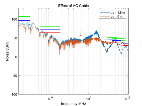 圖3  基于單電控的噪聲頻率對比,AC側(cè)采用直插形式后可觀察到原長線纜帶來的高頻行波振蕩消除